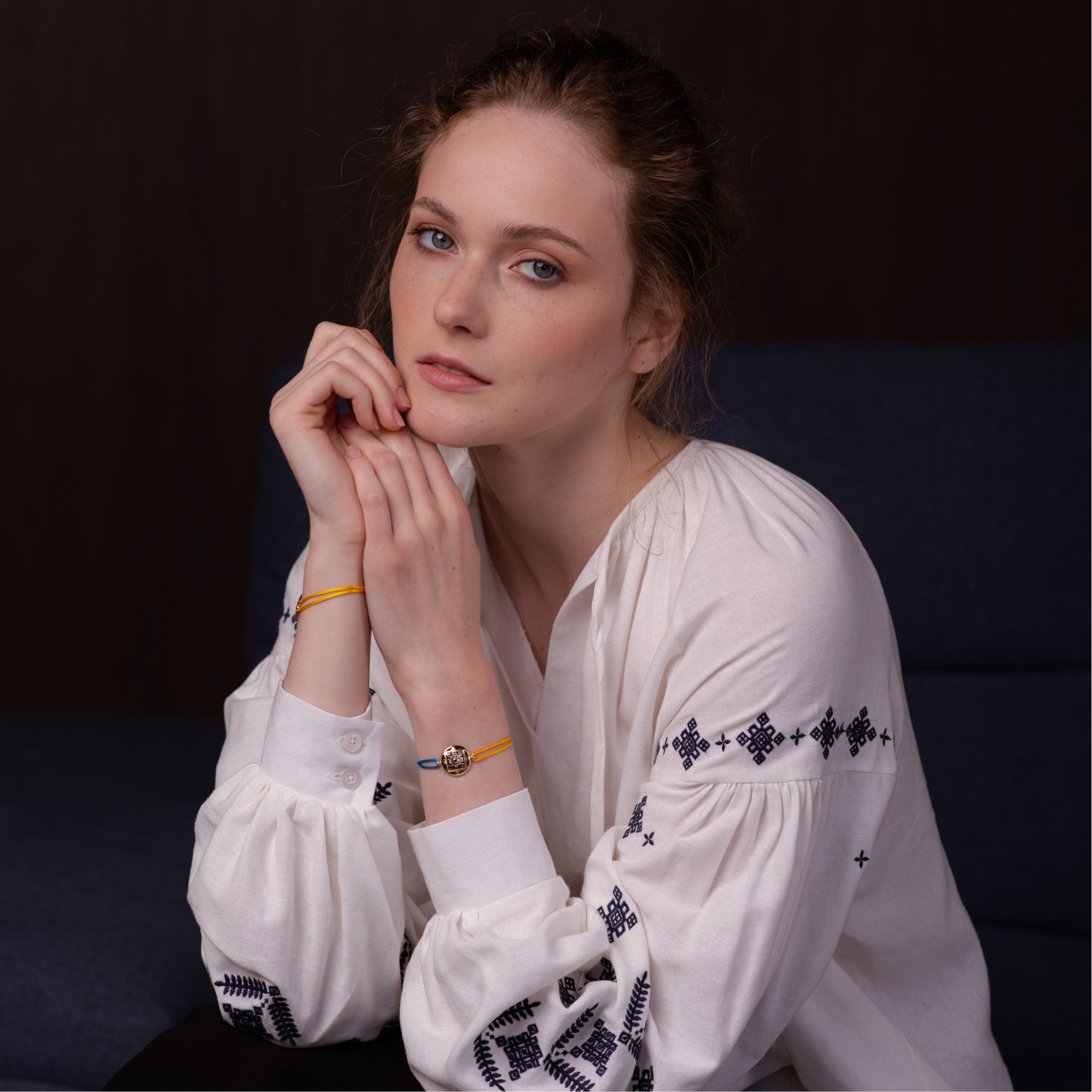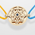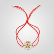 Матеріали: жовте золото 585 проби, сапфір синій, діамант. Розмір браслета: універсальний, регульований. Колір шовкової нитки на вибір: жовто-блакитна, червона. Довжина ланцюжка для підвіски: 45 (см).
